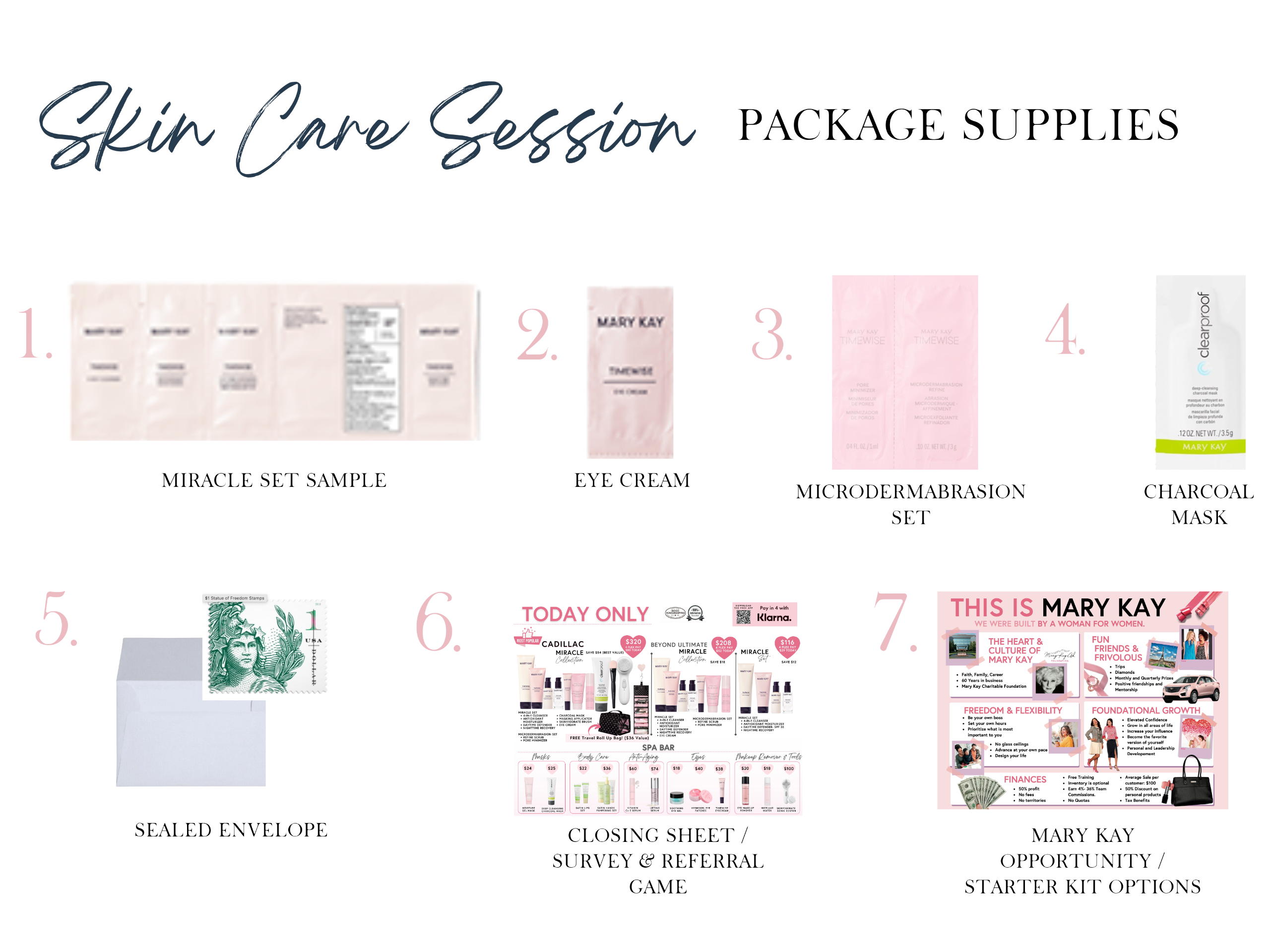 Samples- Skincare SetWhat ever is best suited for them. Usually Timewise Miracle Set:Which includes:4n1 Cleanser, Day Defender, Nighttime Recovery, Antioxidant Moisturizer & Timewise Eye Cream or Timewise Repair if over 35yrs.- Microdermabrasion Set