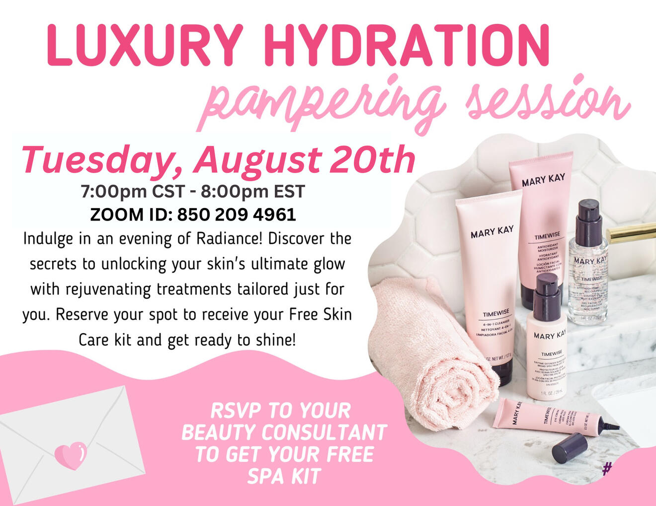 This zoom session will share our Timewise Repair Skincare, Revealing Radiant Facial Peel, Lifting Serum, and Renewing Gel mask. You will have the opportunity to maximize your time and results by booking more than one guest at this event!